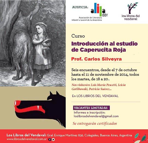 INTRODUCCIÓN AL ESTUDIO DE CAPERUCITAa cargo del Prof. Carlos Silveyra en Libros del Vendaval a partir del 7 de octubre…INSCRIBITE en Libros del Vendaval! INTRODUCCIÓN AL ESTUDIO DE CAPERUCITA Navegación de entradas NOTICIAS, RESEÑAS Y TODA INFORMACIÓN LIJLas aventuras de Fernán y Malena – INVASIÓN DE ABEJAS