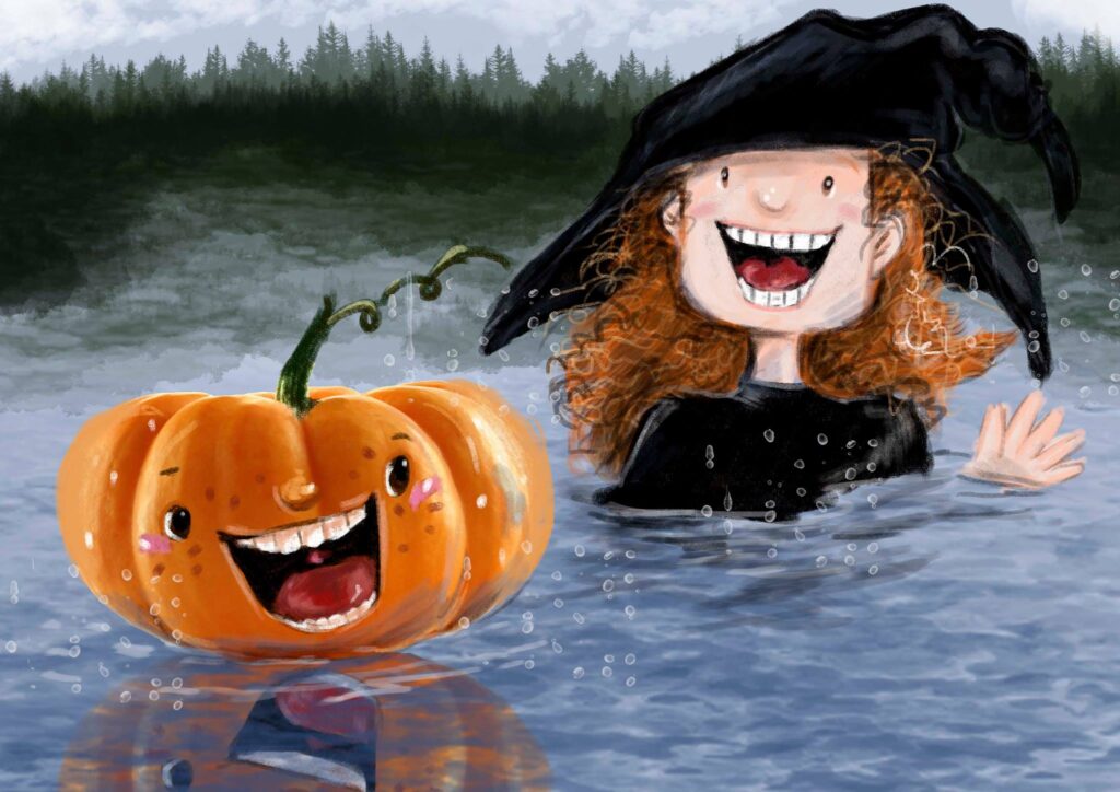 El agua estaba fresca y limpia… La bruja no logró hacer ninguna bribonada porque el zapallo era un gran nadador y como poseía un corazón grande y generoso, invitó a la bruja: