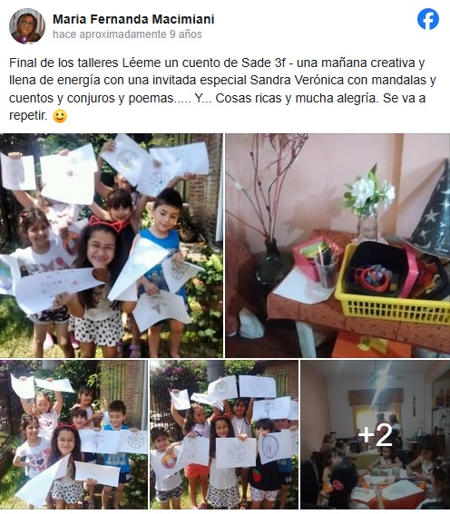 *Taller Infantil de cuentos y Taller de escritura creativa* Así fue el final de los Talleres 2016: “Léeme un cuento” SADE 3FTaller de cuentos y mandalas para chicos y grandespor Sandra Wasilewsky y Fernanda MacimianiINSCRIBITE EN LOS TALLERES 2017 – fernanda@leemeuncuento.com.ar | 1541775170¡Comenzamos en Abril y continuamos todo el año!Talleres LÉEME UN CUENTO de SADE 3F Léeme un cuento cerró sus Talleres de escritura para chicos y adultos 2016 Navegación de entradas Demos. Una Aventura en el planeta (Mag-105) – Sandra Zulema LioneDespués de la nieve – Sophie Crockett