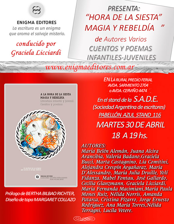 En la Feria del Libro de Bs. As. estaremos firmando ejemplares, los autores de la Antología de cuentos y poemas . Literatura infantil y juvenil. “A la hora de la siesta. Magia y Rebeldía” de editorial Enigma Editores.