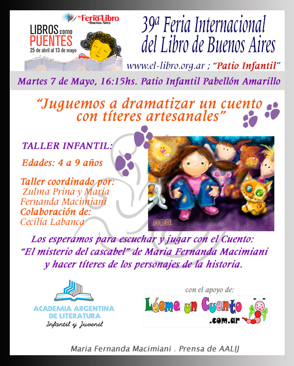 Zulma Prina y Maria Fernanda Macimiani coordinarán un Taller Infantil en la Feria del Libro de Bs. As. con la colaboración de Cecilia Labanca, las tres en representación de la Academia Argentina de Literatura Infantil y Juvenil. Será el día 7 de mayo a las 16:15 hs. en el Patio Infantil Pabellón Amarillo.